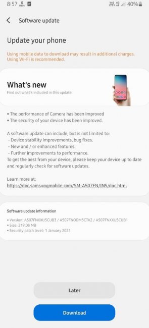 Система вышла с номером сборки A507FNXXU5CUB3 и весит 219 МБ.