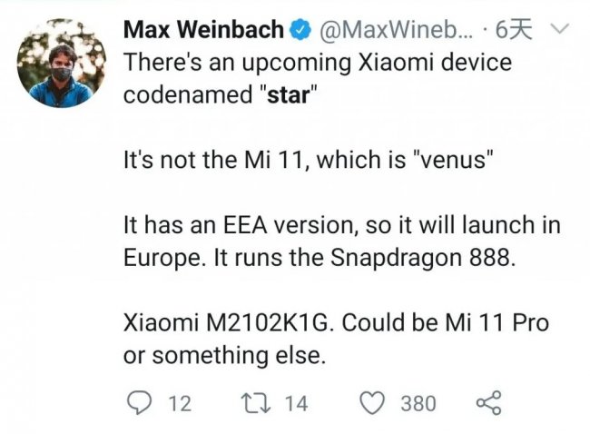 По информации инсайдера Макса Вайнбаха (Max Weinbach), это смартфон под кодовым обозначением Star и каталожным номером M2102K1G. Но это точно не Xiaomi Mi 11, так как он проходит под другим кодовым обозначением — Venus.