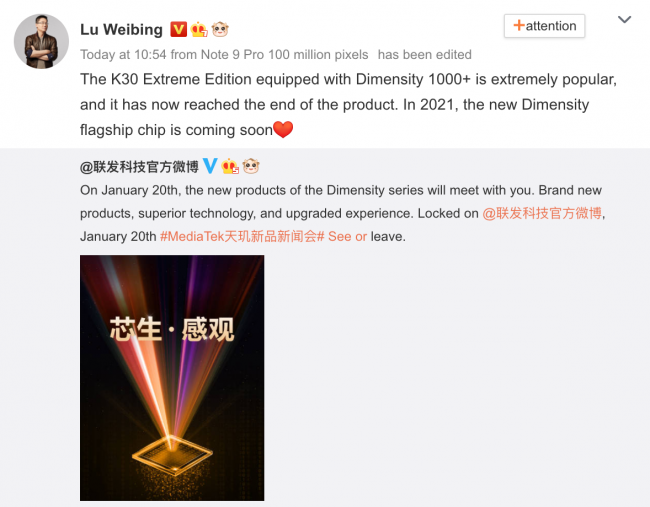 Это будет один из смартфонов линейки Redmi K40. Информацией поделился генеральный менеджер бренда Лю Вейбинг (Lu Weibing) у себя на странице в Weibo. По его словам, компания решила пойти на такой шаг из-за высокого спроса на прошлогодний смартфон Redmi K30 Ultra (фото обложки), который поставлялся с чипом Dimensity 1000+.