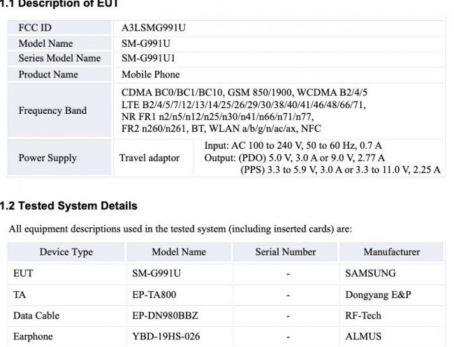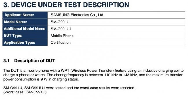 Аппарат прошёл сертификацию в американском агентстве FCC с номером модели SM-G991U. Согласно документам, новинка будет поддерживать быструю проводную зарядку на 25 Вт. Кроме этого, аппарат получит реверсивную зарядку на 9 Вт. Для сравнения, пока ещё актуальное поколение Galaxy S20 поддерживает реверсивную зарядку на 5 Вт.