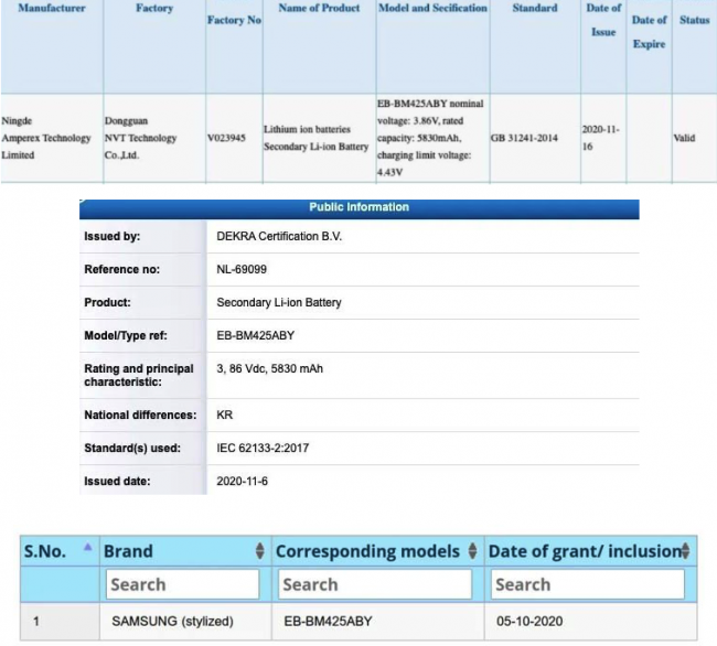 Как сообщает издание SamMobile, Galaxy M42 с номером модели SM-M425F прошёл сертификацию в китайском регуляторе 3C (China Compulsory Certification). Согласно документам, аппарат оснастят батареей EB-BM425ABY, которая получит объём в 6000 мАч. Кстати, аппарат с таким аккумулятором также появился в индийском агентстве BIS.