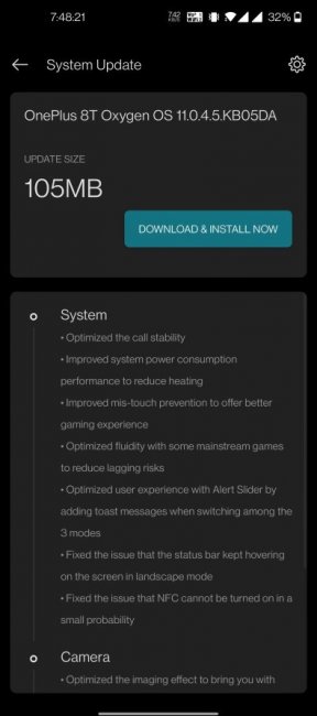 Разработчики «выкатили» очередную прошивку для смартфона с номером сборки OxygenOS 11.0.4.5 и весом в 105 МБ. В обновлении исправили множество ошибок. Например, проблему с работой NFC и зависание строки состояния в ландшафтном режиме. Также компания улучшила камеру смартфона, оптимизировала звонки, мобильную сеть, производительность, автономность и многое другое.
