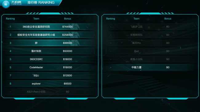 По итогам соревнований с большим отрывом победила команда китайского технологического гиганта Qihoo 360 (360 Enterprise Security and Government and (ESG) Vulnerability Research Institute, она же Team 360Vulcan). Они забрали бОльшую часть призового фонда — $744 500. Второе место заняли эксперты из Ant-Financial Light-Year Security ($258 000), а третье место и $99 500 достались частному исследователю по кибербезопасности.