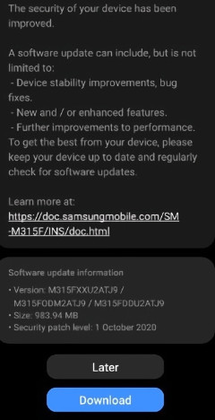 Новая версия системы вышла с номером сборки M315FXXU2ATJ9 и октябрьским патчем безопасности. Прошивка весит почти 1 ГБ. OTA уже начали распространять по воздуху на смартфоны в Индии. В других странах обновление выйдет в ближайшие недели.