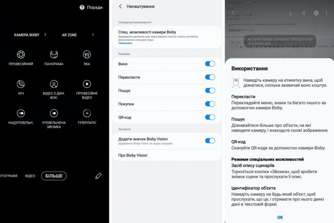 Мой опыт регулярного использования Bixby начался с наиболее часто используемых возможностей смартфона. Разумеется, речь идет о камере. В камерах Samsung раздел Bixby появился несколько лет назад. И в него вошли все умные сервисы, для которых нужна камера. В первую очередь это, конечно же, чтение QR-кодов. Сами QR-коды у нас не так распространены, как, например, в Китае, где ими пользуются все от мала до велика, но иногда чтение кодов все же нужно и в наших условиях. В камерах смартфонов Samsung эта функция доступна в разделе Bixby. А еще там есть переводчик (используется функциональность Google Translate). Есть еще несколько режимов работы камеры Bixby, которые для нашей страны неактуальны. Например, Покупки — объект, на который наведена камера ищет товары в магазине Amazon. Вино (нужно навести камеру на этикетку бутылки вина) — используется сервис Vivino. Поиск — речь не о поиске вообще, а о поиске интересных предметов (как указано в комментарии при съемке, «для вдохновения», используются сервисы Microsoft и Pinterest. Кстати, во Франции я как-то интереса ради искал этикетку вина, которое нам принесли в ресторане, и действительно нашел его, удивив окружающих своими «знаниями» о вине. В новой версии камеры Bixby, которая используется в Galaxy Note 20 Ultra, есть еще несколько режимов: Описание сцены, Идентификатор объекта, Чтение текста и Детектор цвета. Все это может быть полезным для незрячих людей (у нас, кстати, есть отдельный интересный текст о том как пользуются смартфонами незрячие люди). И все это работает, но, повторюсь, на практике это может быть удобно для незрячих или для приятного времяпрепровождения с современными технологиями, а практическая польза есть от чтения QR-кодов.