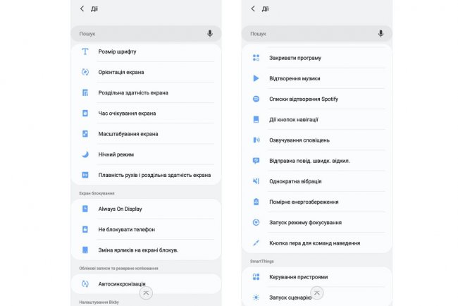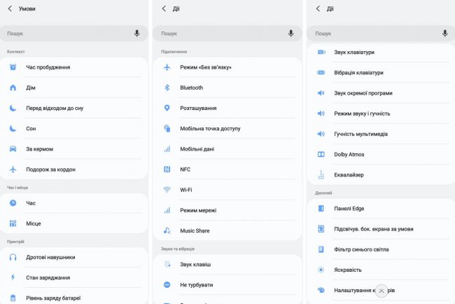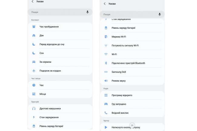 Список условий для сценариев занимает два экрана меню. Событиями могут временные промежутки, локации (дом, офис, дача, любимый кинотеатр или площадка для выгула собак) подключенные устройства. Триггерами могут стать запуск конкретных приложений, уровень заряда батареи. Огромное поле для экспериментов!