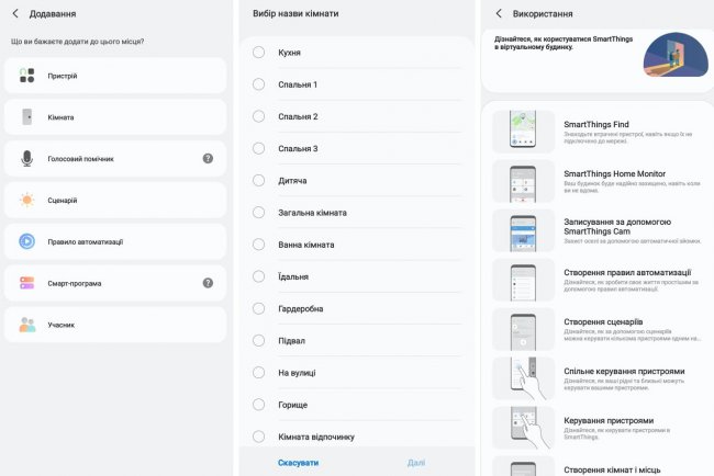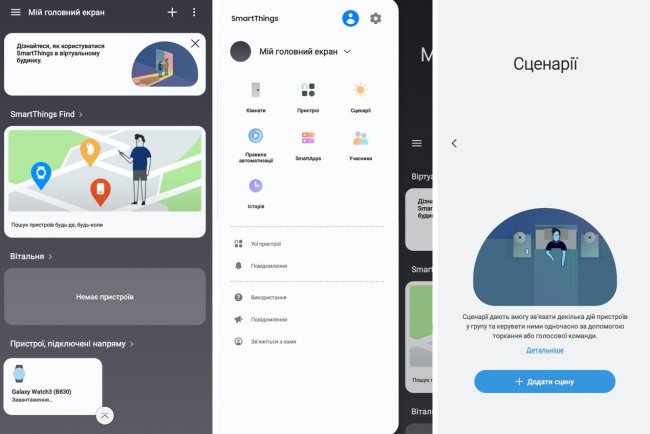 Но самое интересное кроется в последнем действии — Запуск сценария, который открывает окно в отдельную вселенную интернета вещей (Samsung это называет SmartThings). Запускается соответствующее приложение для управления всеми (по большей частью — будущими) устройствами умного дома:
