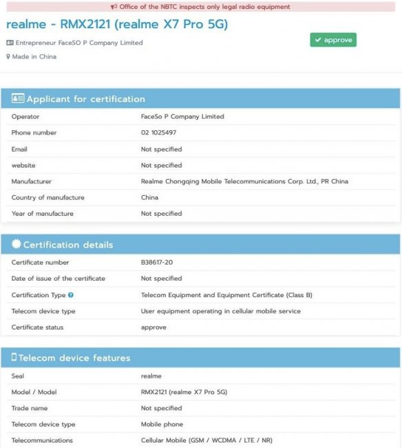 Наши коллеги из MySmartPrice заметили в базе данных таиландского сертификационного агентства NBTC смартфон Realme X7 Pro 5G с номером модели RMX2121. Это значит, что производитель собирается выпустить новинку за пределами Китае. Когда состоится презентация — официальной информации нет. Сейчас компания пока готовится к анонсу смартфонов Realme 7 и Realme 7 Pro в Европе.