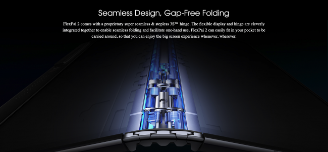 Royole FlexPai 2 получил множество улучшений, но самое главное — обновлённая OLED-панель Cicada Wing 3-го поколения с новым шарниром Stepless 3S Hinge, который поворачивается на 180 градусов. Благодаря ему, в сложенном состоянии новинка теперь не имеет зазора. Также, по словам компании, смартфон на 40% стал тоньше своего предшественника. Ещё аппарат оснастили 7.8-дюймовым экраном с разрешением 1920×1440 пикселей и соотношением сторон 4:3. Если его сложить, то получится два дисплея на 5.5″ (1440×900p) и 5.4″ (1440×810p).