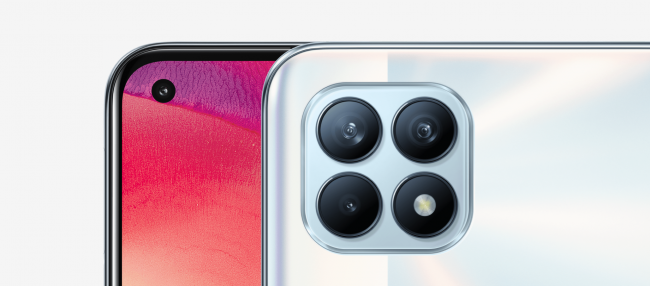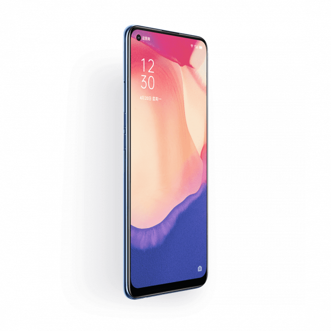 Аппарат получил название Reno 4 SE. Его оснастили стеклянным корпусом и AMOLED-дисплеем с диагональю 6.43 дюйма. Экран получил вырез для фронтальной камеры, разрешение FHD+, соотношение сторон 20:9 и стандартную частоту обновления картинки — 60 Гц. Дисплей, по словам производителя, занимает 90.8% площади всей передней панели.