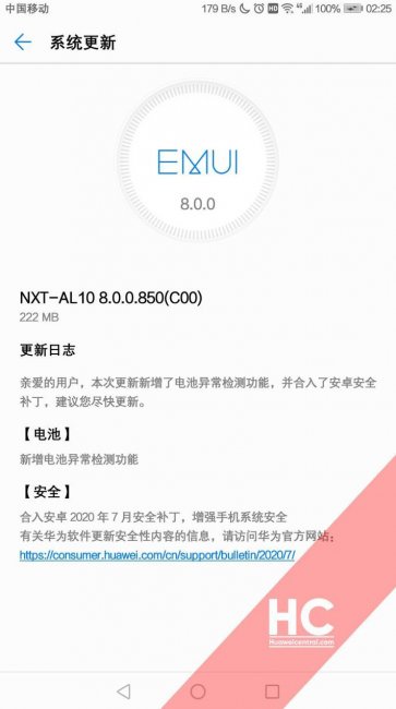 Обновление с номером NXT-AL10 поставляется с EMUI 8.0 версии 8.0.0.850 (C00) и размером пакета обновления 222 МБ.
