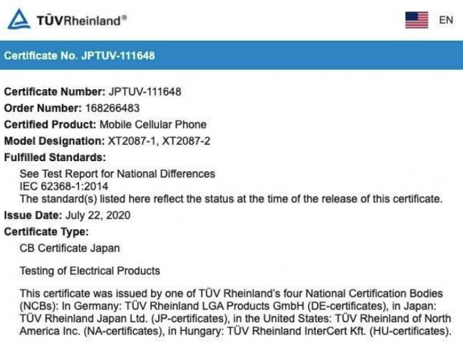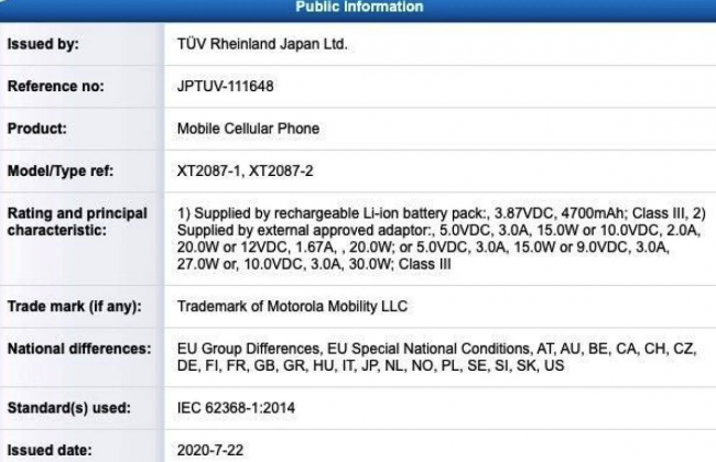 В базе данных сертификационного агентства TUV Rheinland заметили новый смартфон компании Motorola. Что известно Аппарат проходит с номерами моделей XT2087-1 и XT2087-2. Как сообщают сразу несколько источников, это Moto G9 Plus. Согласно утечке, новинку оснастят аккумулятором на 4700 мАч. Кроме