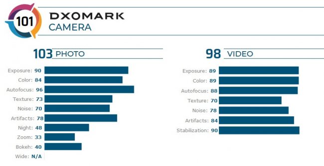 Здесь результат довольно посредственный: 103 балла за фото, 98 за видео и средняя оценка 101.