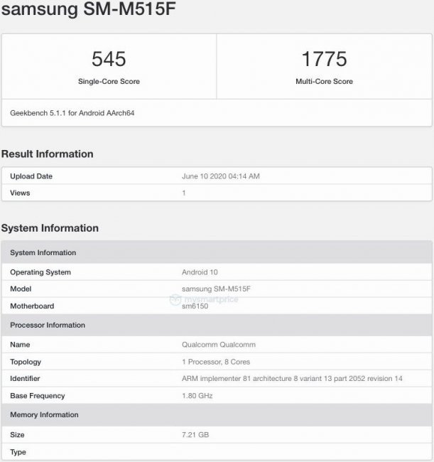 Тестовую версию аппарата заметили в базе данных Geekbench. Устройство проходит с номером модели SM-M515F. Новинка работает под управлением восьмиядерного процессора Qualcomm. Точная модель чипа не указана, но предположительно речь идёт о SoC Snapdragon 720 или Snapdragon 662. Кроме этого, в тестовой версии устройства установлена ОС Android 10.