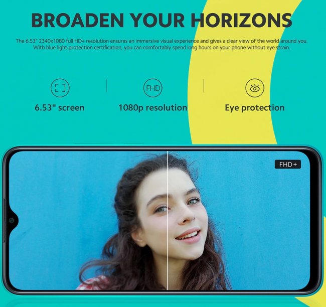 Сразу отметим, что это уже глобальная версия «девятки». У смартфона 6,53-дюймовый LCD дисплей с разрешением Full HD+ (2340×1080 пикселей) и вырезом-капелькой и небольшим «подбородком».