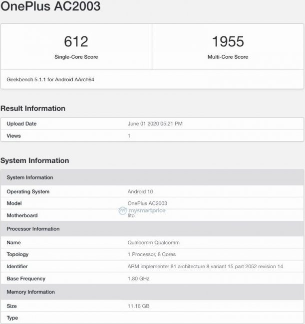 Новинку заметили в базе данных теста производительности Geekbench. Аппарат проходит с номером модели AC2003. У него установлен процессор Qualcomm с кодовым названием Lito. Его модель не указана, но это точно чип среднего уровня Snapdragon 765G. Кроме него, тестовая версия устройства ещё имеет 12 ГБ оперативной памяти и предустановленную операционную систему Android 10. В одноядерном тесте OnePlus Z набирает 612 баллов, а в многоядерном — 1955.