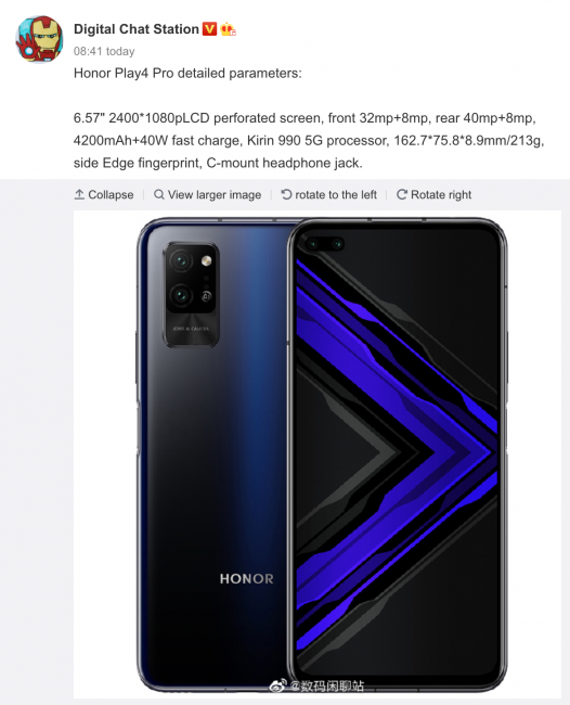 Китайский инсайдер Digital Chat Station опубликовал подробные спецификации смартфона Honor Play 4 Pro до анонса.
