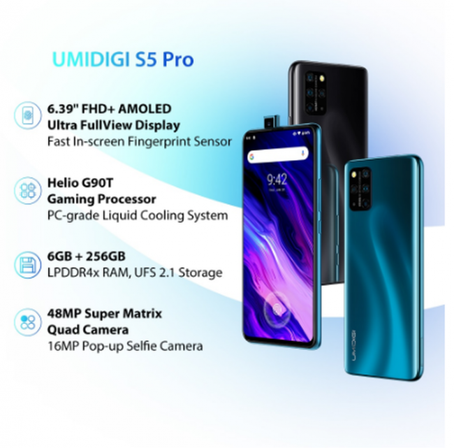 Также можно заказать на AliExpress более дорогой UMIDIGI S5 Pro с 6,39-дюймовым дисплеем, чипом MediaTek Helio G90T, 6/256 ГБ памяти, подэкранным сканером отпечатков, батареей на 4680 мАч с поддержкой быстрой зарядки мощностью 18 Вт и квадрокамерой за$249.99. Для первых 500 покупателей в подарок идут часы.
