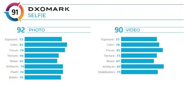 За фото камера получила 92 балла, за видео — 90. В числе плюсов — хорошая детализация и выдержка при съемке со вспышкой, а также приятный цвет на фото, особенно при ярком свете. При съемке видео специалисты отметили точную экспозицию, приятную цветопередачу, эффективную стабилизацию и хорошую детализацию.