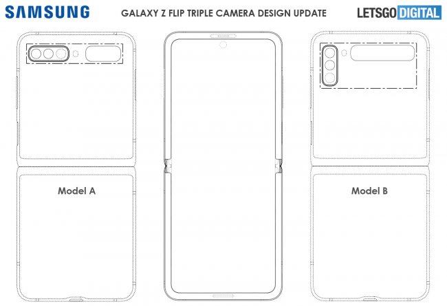 Samsung рассматривает два варианта устройства, которые отличаются расположением модулей основной камеры и размером дополнительного экрана. В первом случае. В первом случае камера тройная и, как у оригинального Galaxy Z Flip, расположена горизонтально. Дополнительный дисплей при этом находится рядом и имеет небольшой размер.