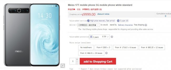 Неизвестна и стоимость Meizu 17T — на JD.com стоит «заглушка» в 9999 юаней.