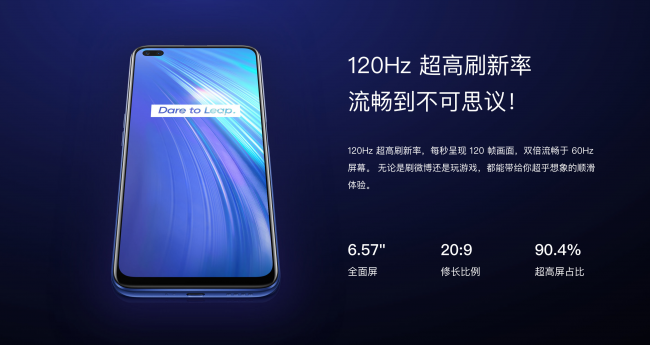 Внешне аппарат ничем не отличается от Realme 6 Pro. Он получил пластиковый корпус с боковым сканером отпечатков пальцев, камеру с четырьмя модулями и широкоформатный IPS-дисплей с отверстием. Диагональ экрана составляет 6.57 дюймов c разрешением FHD+ и частотой обновления картинки 120 Гц.