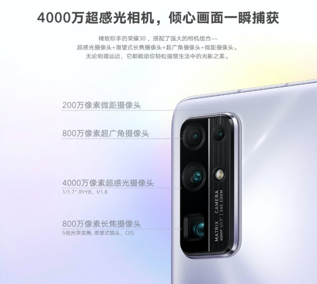 Honor 30 поставляется с 6/8 ГБ ОЗУ и 128/256 ГБ ПЗУ. У него также есть слот для карт Nano Memory до 256 ГБ. Устройство может похвастаться основной квадро-камерой. Главный сенсор Sony IMX600 на 40 Мп. Он поддерживает OIS и имеет светосилу f/1.8. Его дополняет широкоугольный объектив на 8 Мп, а также перископическая линза на 8 Мп со стабилизацией, 5-кратным оптическим и 50-кратным цифровым зумом. Последний сенсор на 2 Мп. Он отвечает за макросъёмку.
