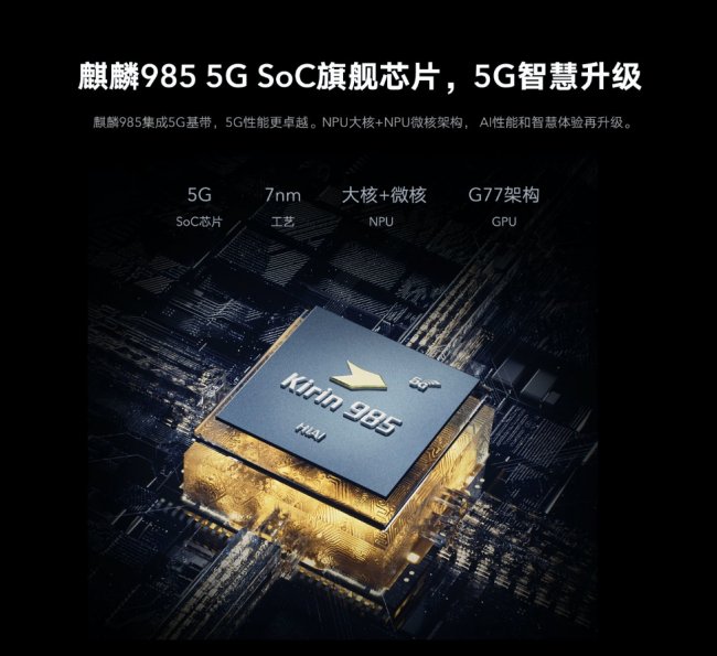 Начнём с младшей модели. Аппарат получил 6.53-дюймовый OLED-дисплей с подэкранным сканером, вырезом для фронтальной камеры на 32 Мп и разрешением Full HD+. Частота дисплея в новинке обычная — 60 Гц. Сердцем смартфона стал новый фирменный процессор Kirin 985. Он имеет два ядра Cortex-A76 с частотой 2.56 ГГц, два ядра Cortex-A76 с частотой 2.40 ГГц и четыре Cortex-A55 с частотой 1.78 ГГц. Они работают в паре с видеоускорителем Mali-G77 GPU и чипом NPU. По сути, это немного улучшенная версия прошлогоднего SoC Kirin 980.