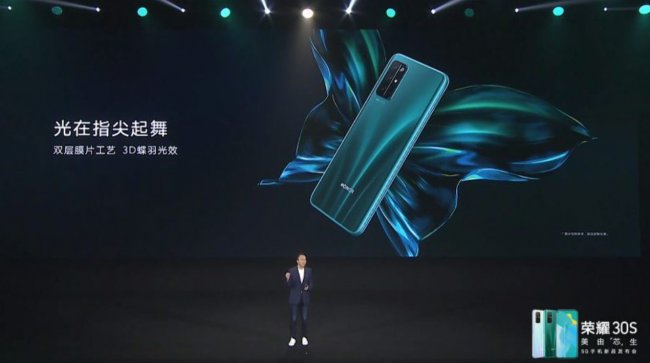 Honor 30S получил 6,5-дюймовый IPS дисплей с разрешением 2400×1080 и соотношением сторон 20:9. Экран занимает 90,3% передней панели. Для фронтальной камеры предусмотрен круглый вырез в левом углу. Сканер отпечатков пальцев находится на торце.