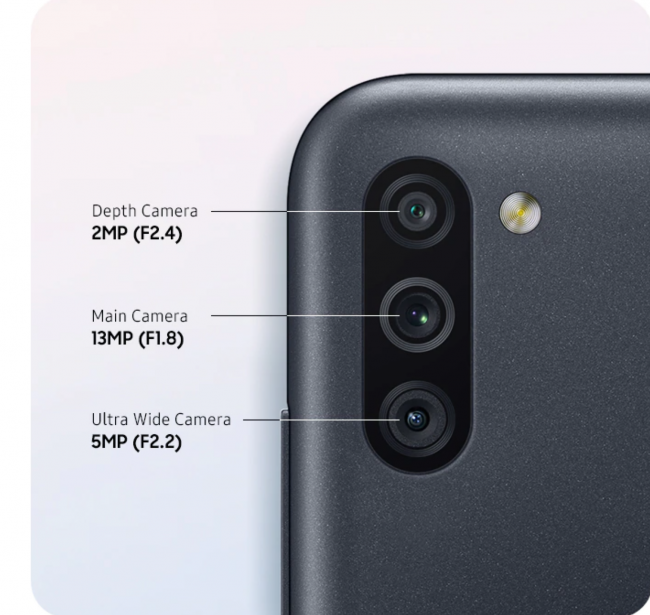 На задней стороне устройства разместили сканер отпечатков пальцев и основную камеру с тремя модулями: 13-мегапиксельный главный сенсор (f/1.8), 5-мегапиксельный «ширик» (f/2.2) с углом охвата 115 градусов и сенсор глубины на 2 Мп. Камера умеет снимать видео в 1080p 30fps.