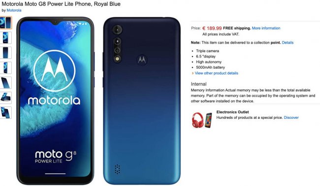 Недавно немецкий инсайдер Роланд Куандт (Roland Quandt) опубликовал рендеры нового бюджетного смартфона Motorola Moto G8 Power Lite, а теперь аппарат «засветился» на европейском сайте Amazon.