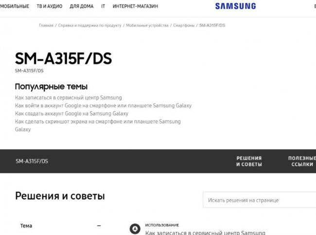 На сайте российской техподдержки компании появился неанонсированный смартфон с номером модели SM-A315F. Речь идёт про Galaxy A31. Никаких характеристик новинки утечка не раскрывает, но аппарат заметили недавно также в тесте производительности Geekbench. В базе данных говорится, что его оснастят процессором MediaTek Helio P65. Кроме этого, новинке ещё приписывают аккумулятор на 5000 мАч, 4 ГБ ОЗУ, 64/128 ГБ ПЗУ и камеру с несколькими модулями и главным сенсором на 48 мегапикселей.
