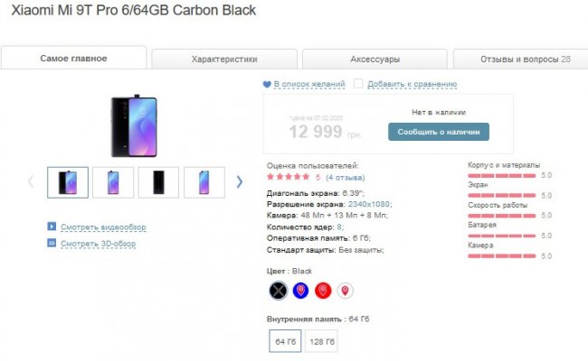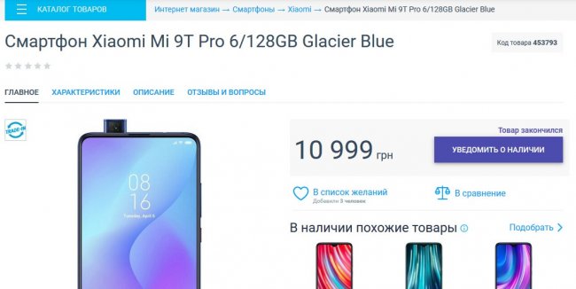 Кстати, Xiaomi Mi 9T Pro уже не продается и в некоторых украинских магазинах. Он есть в ассортименте на сайте, но купить его нельзя — «Нет в наличии».
