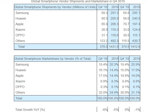 Всего за год было продано 1,41 млрд штук смартфонов, и это на 1% меньше, чем в 2018 году.