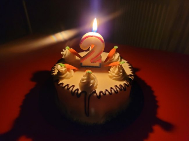 Но можно снимать и в полной темноте. В этом кадре свеча на тортике — единственный источник света.