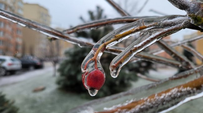 Этот снимок сделан в зимнюю пасмурную погоду, когда Киев накрыл ледяной дождь с гололедом. Этот снимок я сделал за 2 минуты до того, как, чертыхаясь и кляня погоду, разбирался с таким же слоем льда на своей машине, где, помимо проблем с лобовым и задним стеклом, слой льда толщиной в добрый сантиметр заблокировал дверь. На этом снимке наглядно видно как работает боке при макросъемке: фон уже на расстоянии нескольких сантиметров не в фокусе, а задний план вообще красиво размыт.