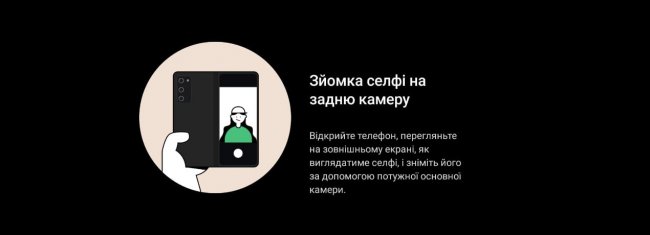 - Благодаря конструкции сгибающегося дисплея, можно снимать селфи на основную камеру.