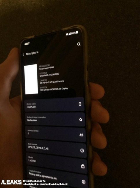 Также в сеть слили «живые» фото якобы прототипа OnePlus 9. Снимок нечеткий, но можно разглядеть плоский дисплей с круглым вырезом по центру и основные характеристики, которые отображаются на дисплее. Это процессор Snapdragon 888, 12 ГБ ОЗУ, 512 ГБ ПЗУ, 6,48-дюймовый AMOLED дисплей с частотой обновления 120 Гц, Android 11 и квадрокамера с датчиками разрешением 48, 48, 8 и 5 МП. Почему у OnePlus 9 камера с четырьмя модулями, а у OnePlus 9 Pro с тремя — непонятно, поэтому стоит дождаться официальной информации.
