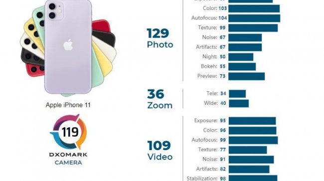 Если раньше iPhone 11 получил от DxOMark 109 баллов, то после тестирования по новому протоколу его оценка значительно выросла — до 119 баллов. 129 он получил за фото, 36 за зум и 109 за видео. При раннем оценивании отдельной категории зума не было. Но стоит учесть, что показатель увеличился не только благодаря ему, ведь с момента выхода смартфон получал обновления, в том числе и с улучшениями камеры.