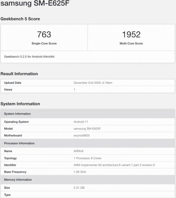 В базе данных Geekbench появился смартфон с номером SM-E625F. По данным инсайдера Ишана Агарвала (Ishan Agarwal), под ним и скрывается новая модель Galaxy F62.