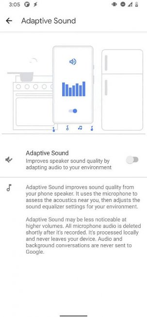 Умельцы из XDA-Developers поковырялись в коде последней версии приложения Device Personalization Services и нашли там упоминание функции Adaptive Sound. Судя по описанию, она будет автоматически подстраивать эквалайзер динамика под окружающую среду. Похожая технология сейчас есть в TWS-наушниках Pixel Buds, но там она регулирует только громкость звука.