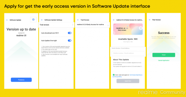 Подать заявку на участие в бета-тесте может любой желающий. Для этого надо перейти в настройки устройства и в разделе «Обновление программного обеспечения» нажать на значок шестерёнки. Затем найти пункт «Пробная версия» и заполнить форму. После этого модераторы проверять информацию и тестовая прошивка с номером сборки RMX2170_11_C.09 и весом в 3.6 ГБ будет доступна для скачивания. Если хотите участвовать в тестировании придётся поторопиться, так как количество мест ограничено.