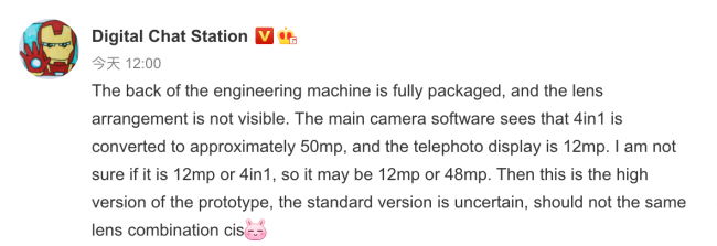 Итак, согласно информации инсайдера Digital Chat Station, аппарат оснастят несколькими модулями камеры. Главный датчик получит разрешение 50 Мп. Его будет дополнять широкоугольный объектив. Инсайдер пока не уверен будет ли это 12-мегапиксельный сенсор или датчик на 48 Мп с технологией Quad-Bayer, которая объединяет четыре пикселя в один.