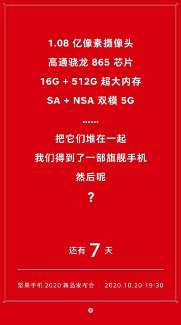 Новинку, судя по всему, назовут Smartisan Nut Pro 4. Она, согласно официальному тизеру, получит топовый процессор Qualcomm Snapdragon 865 со встроенным 5G-модемом.