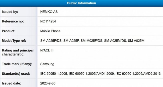 В базе данных устройство проходит с номерами моделей SM-A025F/DS, SM-A025F, SM-M025F/DS, SM-A025M/DS и SM-A025M. То есть, судя по номерам, это Galaxy M02 и Galaxy A02. Учитывая то, что они включены в один и тот же сертификационный документ, можно предположить, что это один смартфон, но с разными названиями.