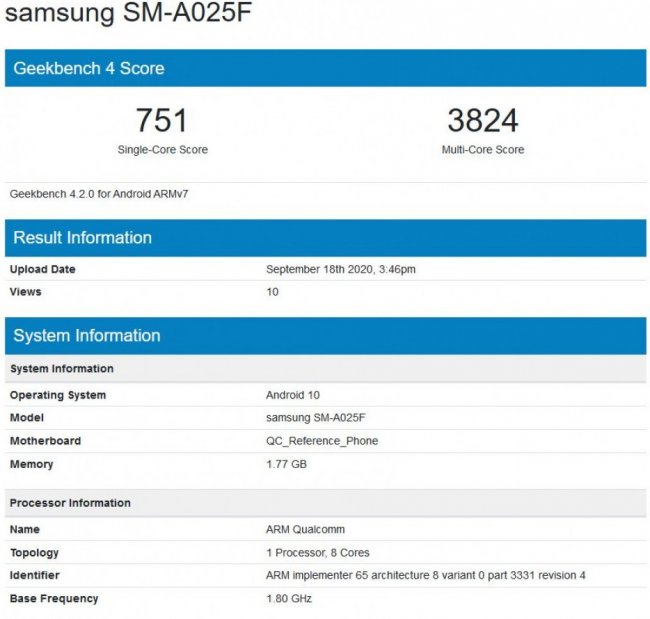 Если эта информация подтвердится, Galaxy M02 (он же Galaxy A02) получит 2 ГБ оперативной памяти 32 ГБ хранилища и процессор Qualcomm, точная модель которого неизвестна. Вся эта информация есть в базе данных GeekBench.