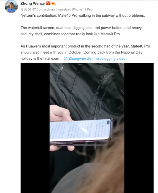 Чжун Венцзе (Zhong Wenze) заметил смартфон в китайском метро и заснял новинку. Судя по специальному защитному чехлу, это будущий флагман Huawei Mate 40 Pro. Аппарат имеет дисплей-водопад и очень тонкие рамки. Кроме этого, на видео можно разглядеть отверстие в экране для двойной селфи-камеры. Дизайн устройства похож на аппарат, который ранее показывал инсайдер OnLeaks.
