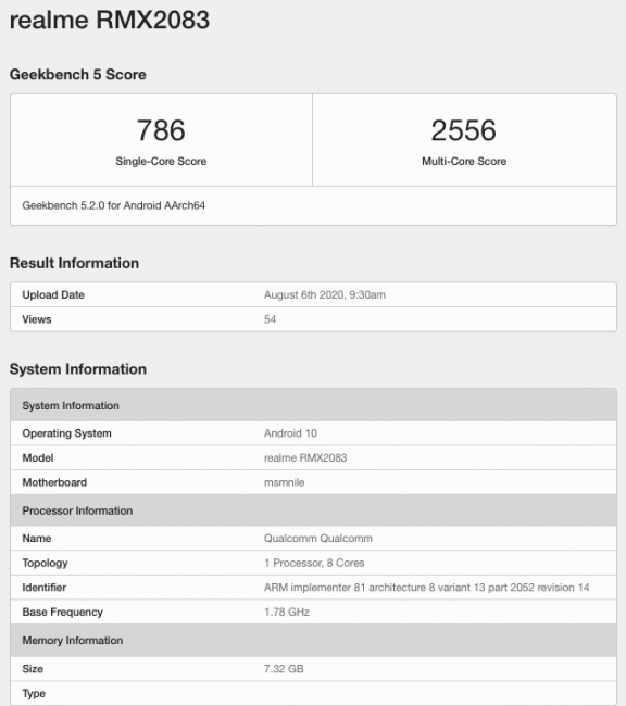 Аппарат проходит с номером модели RMX2083. Как сообщают сразу несколько источников, это Realme X3 Pro. Тестовая версия устройства имеет 8 ГБ оперативной памяти, а также прошлогодний флагманский процессор Qualcomm Snapdragon 855+, который до сих пор отлично справляется со всеми задачами. Кстати, этот же чип установлен в обычном Realme X3 и Realme X3 SuperZoom. Также аппарат имеет предустановленную версию ОС Android 10.
