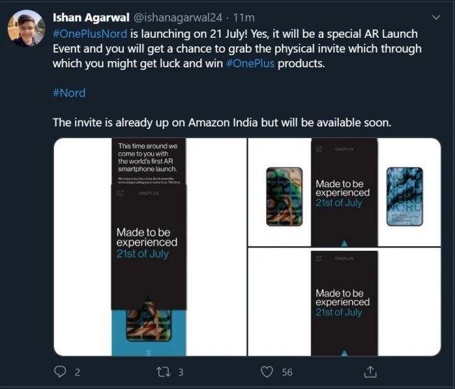 Как следует из рекламных постеров, официальный анонс OnePlus Nord состоится 21 июля, то есть чуть позже, чем ожидалось. Правда, их «слил» инсайдер Ишан Агарвал (Ishan Agarwal), который практически сразу удалил соответствующий пост из соцсетей.