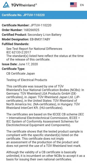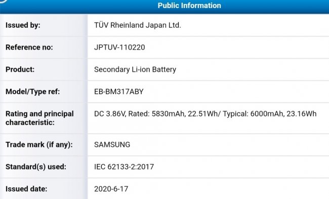 Благодаря сертификации TUV Rheinland стала известна емкость аккумулятора Galaxy M31s — 6 000 мАч. То есть столько же, сколько и у Galaxy M31.
